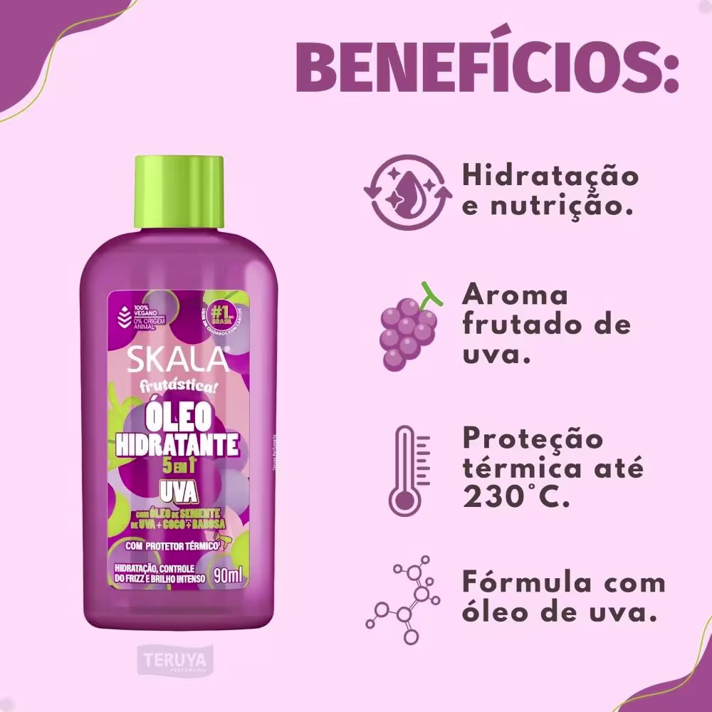 Aplicação: Aplique uma pequena quantidade do Óleo Hidratante Skala 5 em 1 Uva na palma das mãos e espalhe bem.