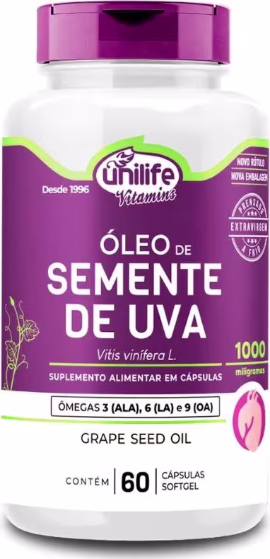 Não sei o CEPÓleo de Semente de Uva 1000mg Unilife é um suplemento em cápsulas a base de em ômega-3 ALA,6 LA e 9 OA.Óleo 100% puro extraído por prensagem a frio.Origem vegetal para melhor cuidados com a saúde e nutrição diária.