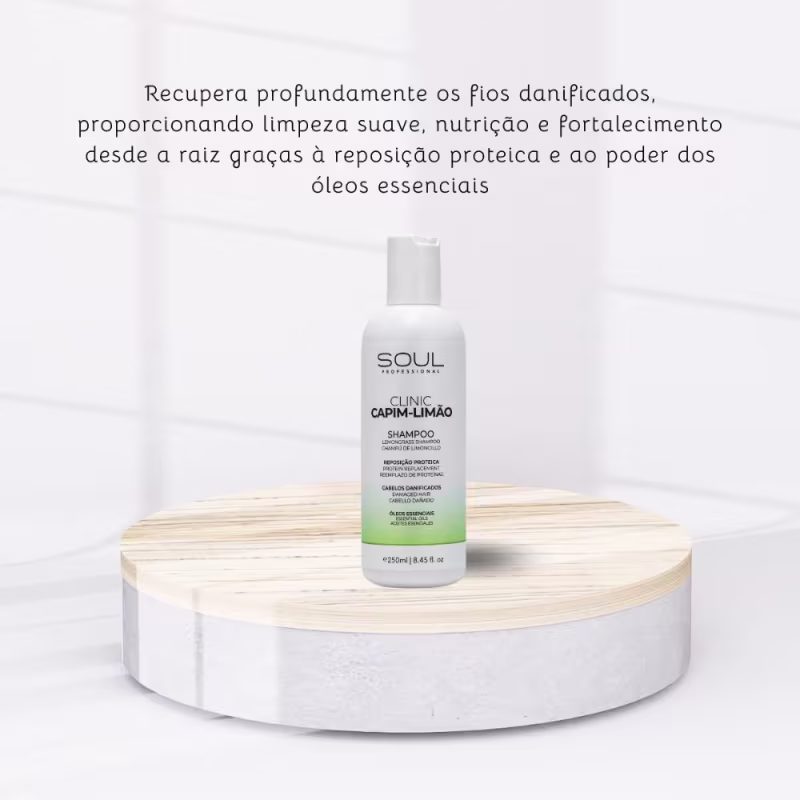 O Shampoo Soul Professional Clinic Capim-Limão 250ml é indicado para cabelos danificados, quebradiços ou fragilizados por processos químicos. Ideal para quem busca reconstrução capilar aliada a uma limpeza suave e revigorante.