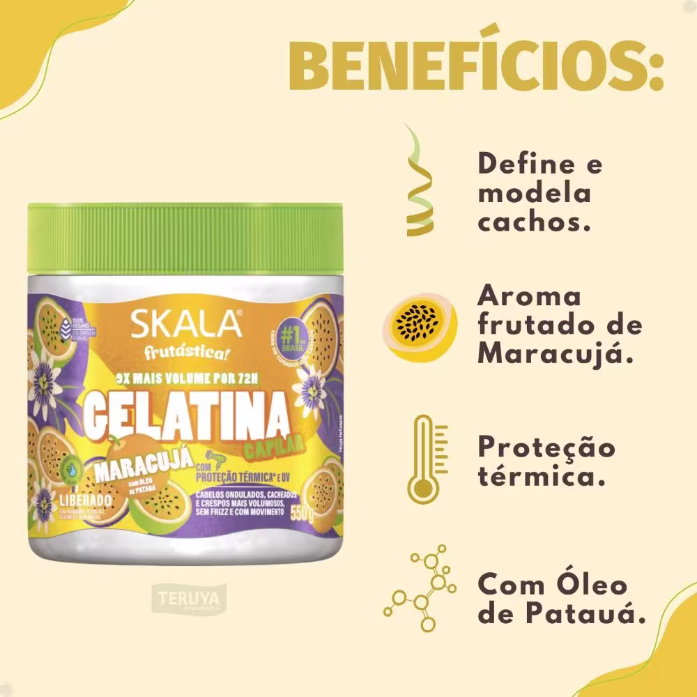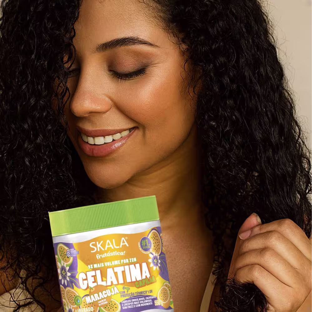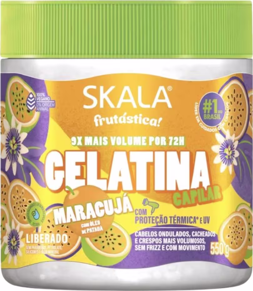 A Gelatina Capilar Skala Frutástica! Maracujá mantém o comprimento saudável dos fios, proporcionando força, resistência e um brilho intenso. Além disso, conta com proteção térmica e UV, formando uma película protetora ao redor da fibra capilar contra altas temperaturas (até 230 graus) de secadores e difusores. Seus cabelos ficarão deslumbrantes, com controle de frizz e movimento.
