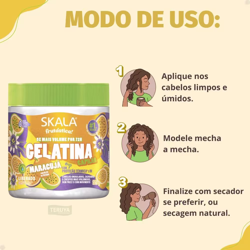 Para manter os cachos mais definidos, umedeça levemente os cabelos e misture a quantidade desejada do Creme Para Pentear 3 em 1 Skala Frutástica Maracujá com a Gelatina Capilar Skala Frutástica Maracujá, finalizando com um difusor ou deixando secar naturalmente.