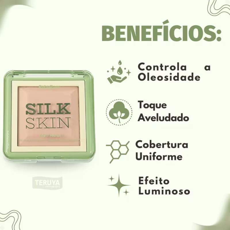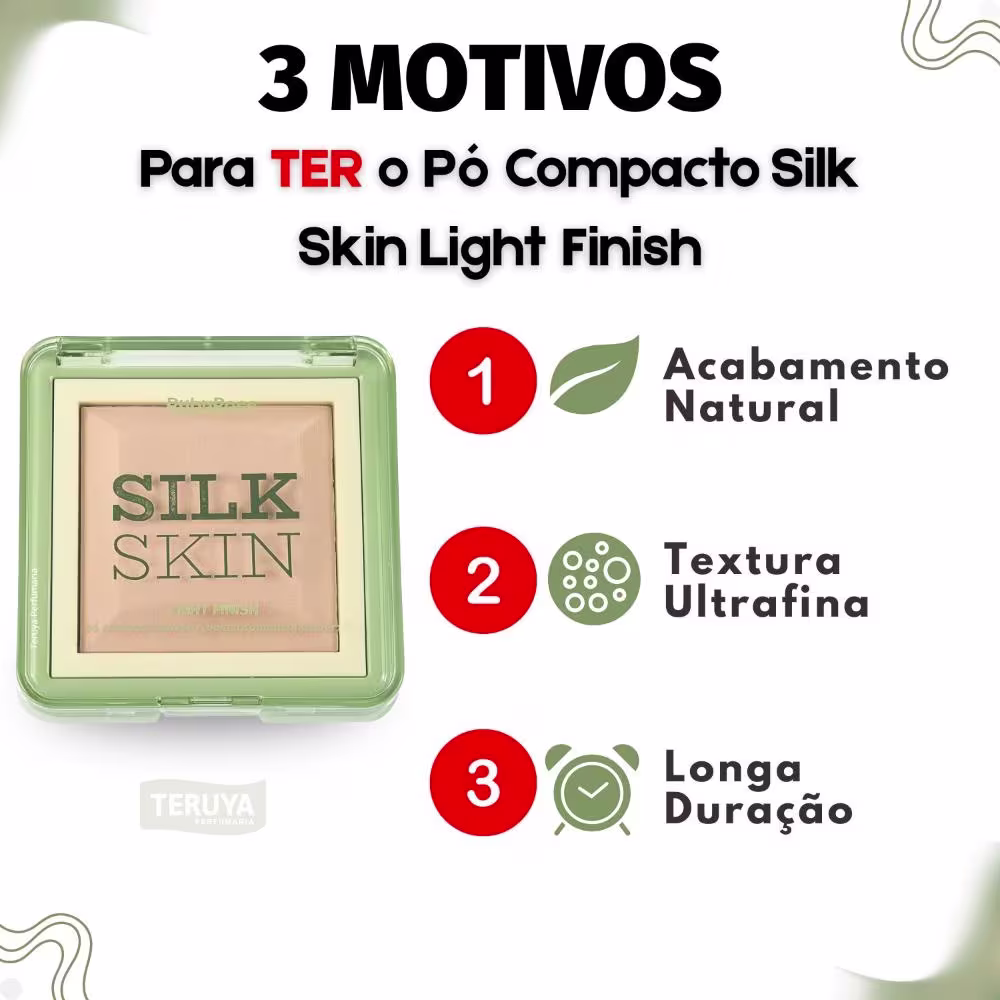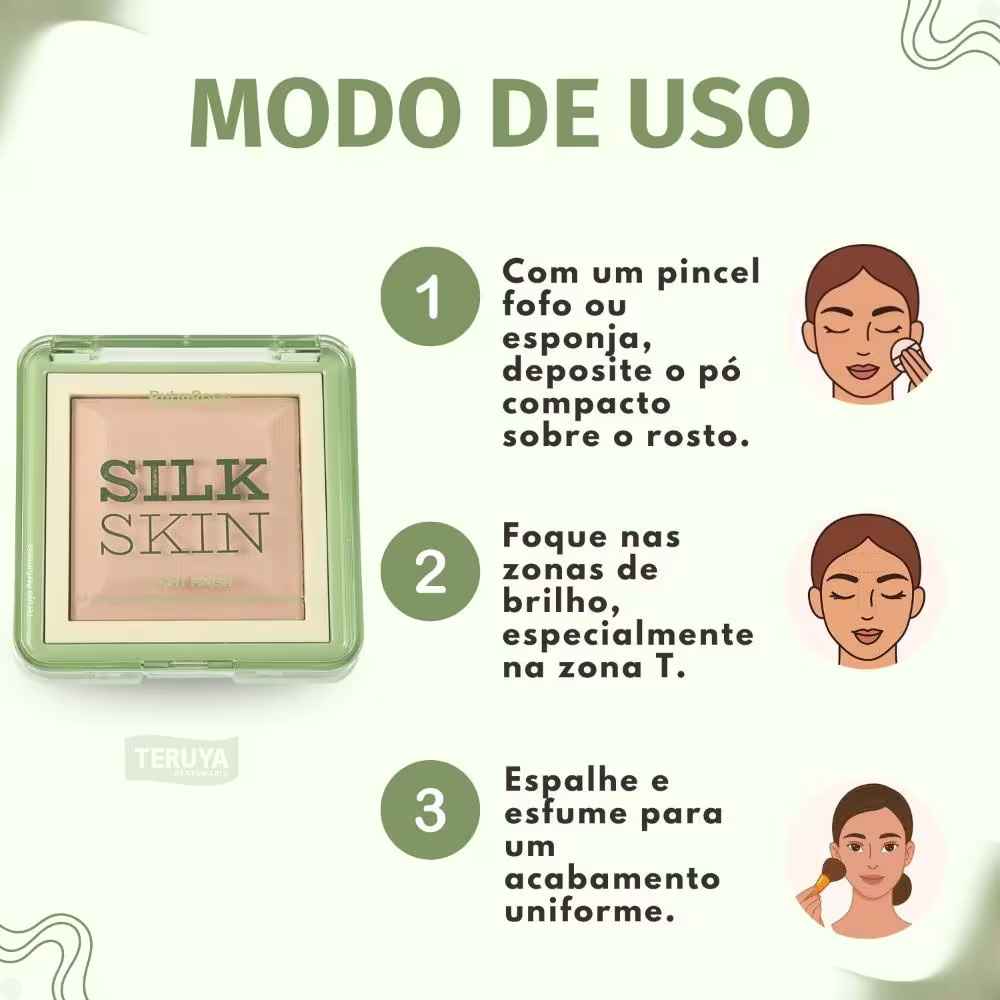 Com o auxílio de um pincel ou esponja, aplique o Pó Compacto Ruby Rose Silk Skin Light Finish PC10 sobre a pele do rosto, especialmente na zona T (testa, nariz e queixo), para selar a maquiagem e controlar o brilho.