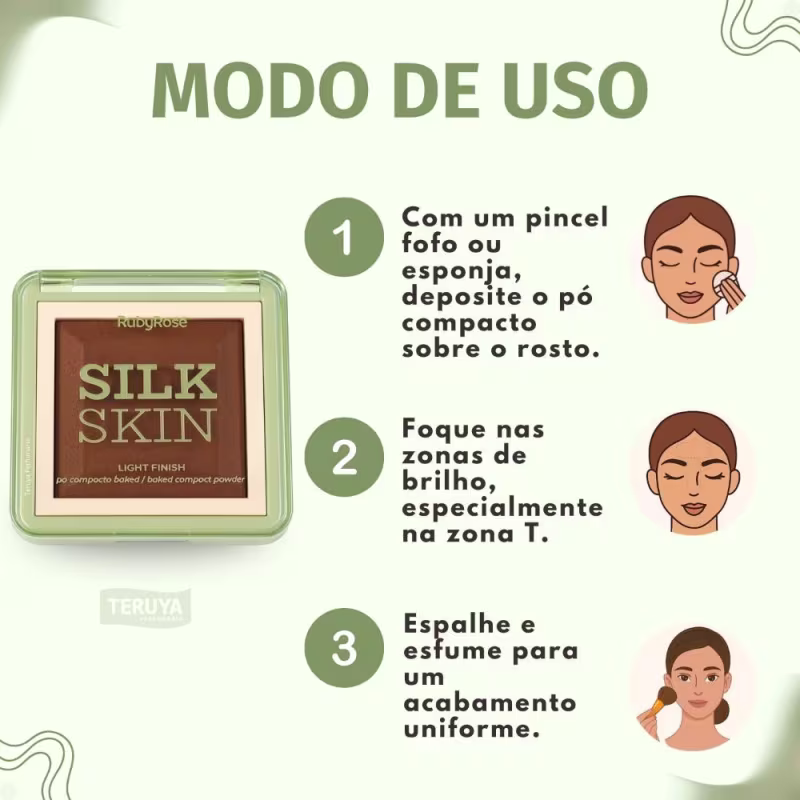 Com o auxílio de um pincel ou esponja, aplique o Pó Compacto Ruby Rose Silk Skin Light Finish PC90 sobre a pele do rosto, especialmente na zona T (testa, nariz e queixo), para selar a maquiagem e controlar o brilho.