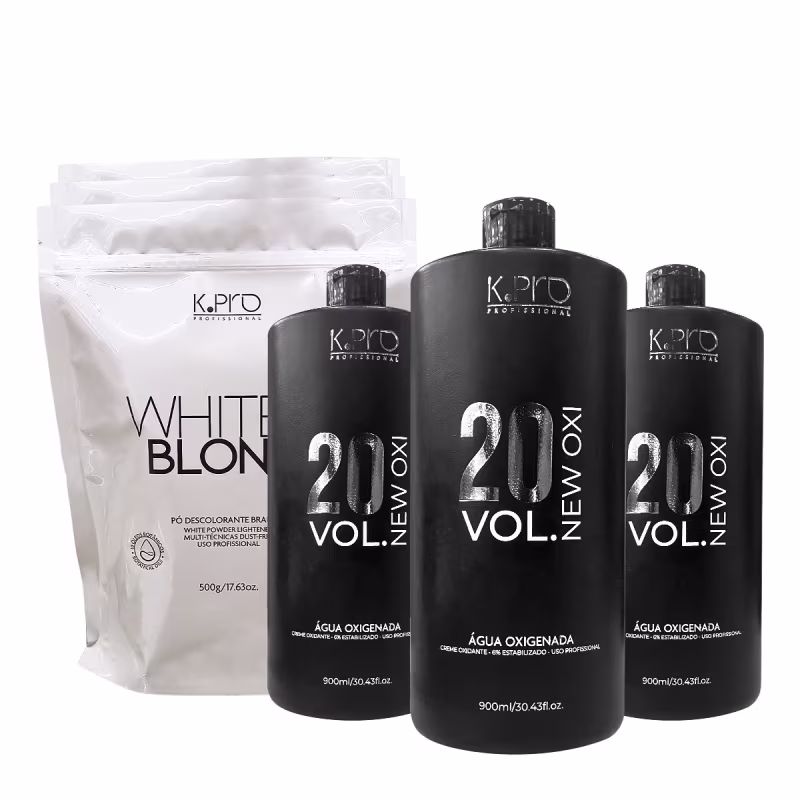 Kit K.Pro White Blonde Ox 20Vol. Trios (6 produtos) Este Kit Contém K.Pro White Blonde Multi-técnicas - Pó Descolorante Branco 500g (3 unidades): É Dust Free (evita a suspensão do pó) e de alta performace. Fórmula exclusiva que proporciona clareamento uniforme e progressivo. Possui uma combinação de 10 óleos essenciais e orgânicos específicos para proporcionar uma ação suave, protetora e hidratante para a estrutura dos fios. K.Pro New Oxi 6% - Oxidante 20 Volumes 900ml (3 unidades): O K.Pro Profissional Oxidante New OX 20 Volumes é um creme para ser utilizado no preparo de colorações e descolorações para cabelos. Ele garante uma mistura homogênea e de fácil aplicação. Conselho de Aplicação Pó Descolorante: em um recipiente não metálico adicione proporção de 1 medida de pó descolorante para 11⁄2 até 3 medidas de Água oxigenada, da volumagem adequada para a necessidade de clareamento e da técnica escolhida, misture suavemente até obter uma consistência homogênea e cremosa. Use luvas adequadas. Aplique a mistura com a ajuda de um pincel. Sempre faça uma prova de toque antes de aplicar produto. Faça teste de resistência em cabelos com históricos de alisamentos, relaxamentos, progressivas e ou outras químicas.Oxidante: as proporções devem seguir as instruções da coloração, tonalizante ou descolorantes. É importante antes do uso fazer o teste de mecha.