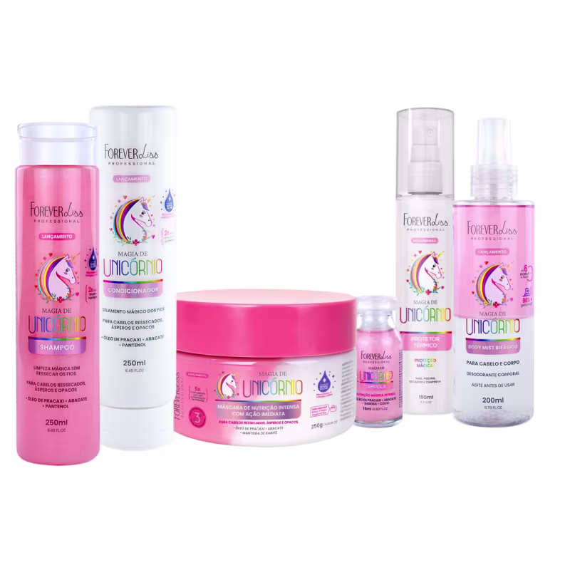 O Kit Completo Magia de Unicórnio Forever Liss é um tratamento capilar completo, desenvolvido para restaurar, nutrir e perfumar os fios com um brilho mágico. Sua fórmula é rica em ativos naturais como óleo de coco, óleo de pracaxi, óleo de abacate, extrato de babosa e D-pantenol, que agem desde a raiz até as pontas, promovendo brilho intenso, hidratação profunda, nutrição e maciez.