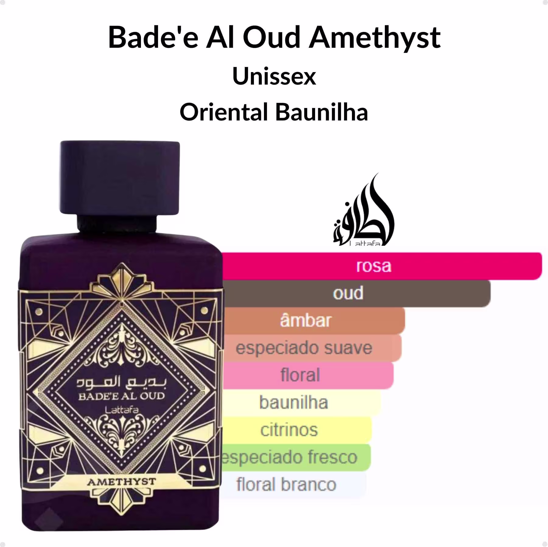 Lattafa Amethyst Bade’e Al Oud: Uma joia árabe unissex. Frescor, rosas e um Oud opulento e marcante.
