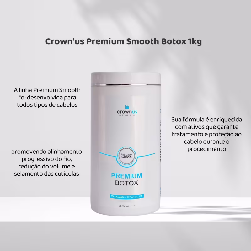 O Botox Capilar Crown'us Premium Smooth oferece tratamento intensivo com reposição de massa e alinhamento capilar. Reduz volume e proporciona brilho espelhado sem agredir os fios.