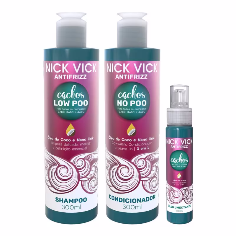 O Kit Shampoo Condicionador e Óleo Umectante Cachos Low Poo Nick Vick Antifrizz realça a beleza de todos os tipos de cabelos cacheados.
