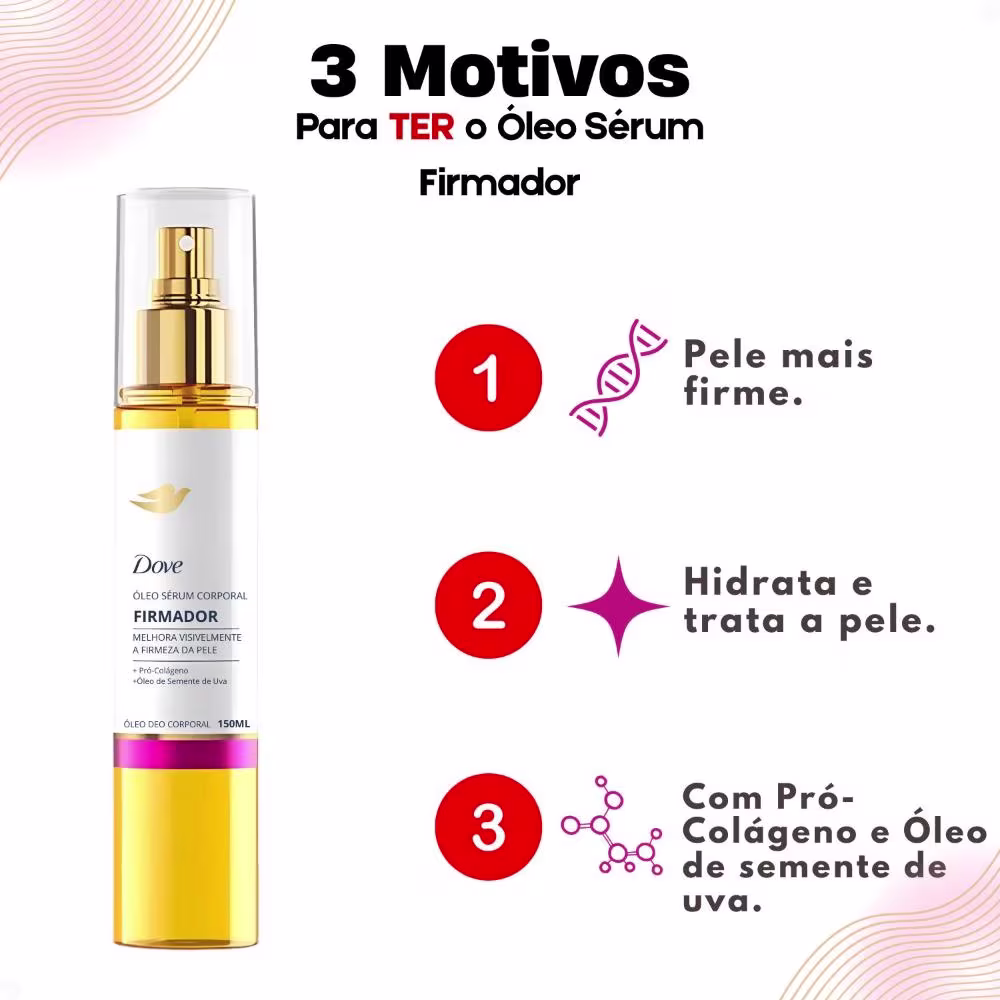 Aplique uma quantidade adequada do Óleo Sérum Corporal Dove Firmador Pró Colágeno sobre a pele limpa e seca.