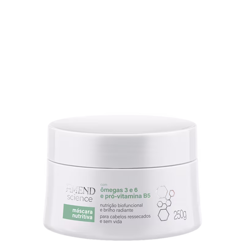 Máscara capilar nutritiva. Amend Science Ômega 3 e 6 E Pró-Vitamina B5 hidrata, aumenta elasticidade e protege os fios contra quebras.