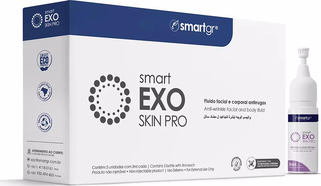 O SMART EXO SKIN PRO - SMART GR é um fluido facial e corporal avançado que combina exossomas inteligentes e ingredientes poderosos para promover rejuvenescimento, hidratação e uma pele mais uniforme. Com uma fórmula inovadora, ajuda a reduzir linhas e rugas, melhorar a textura e proporcionar um aspecto mais saudável e luminoso.