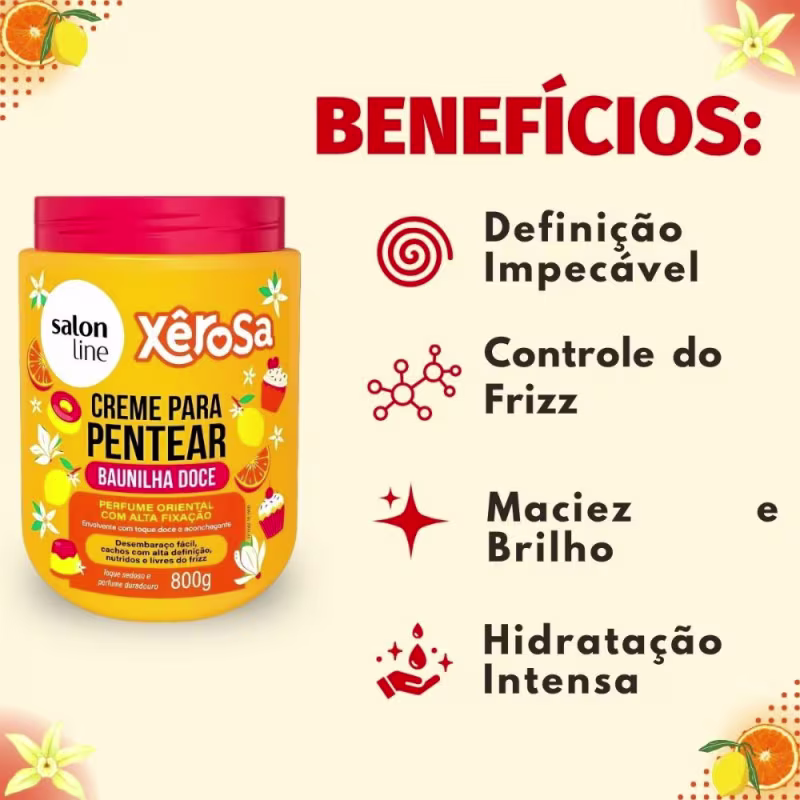 Cabelos Limpos e Úmidos: Aplique o Creme Para Pentear Salon Line Xêrosa Baunilha Doce mecha a mecha, nos cabelos limpos e úmidos.