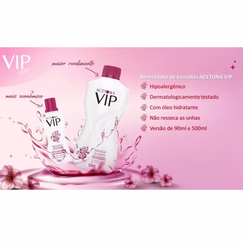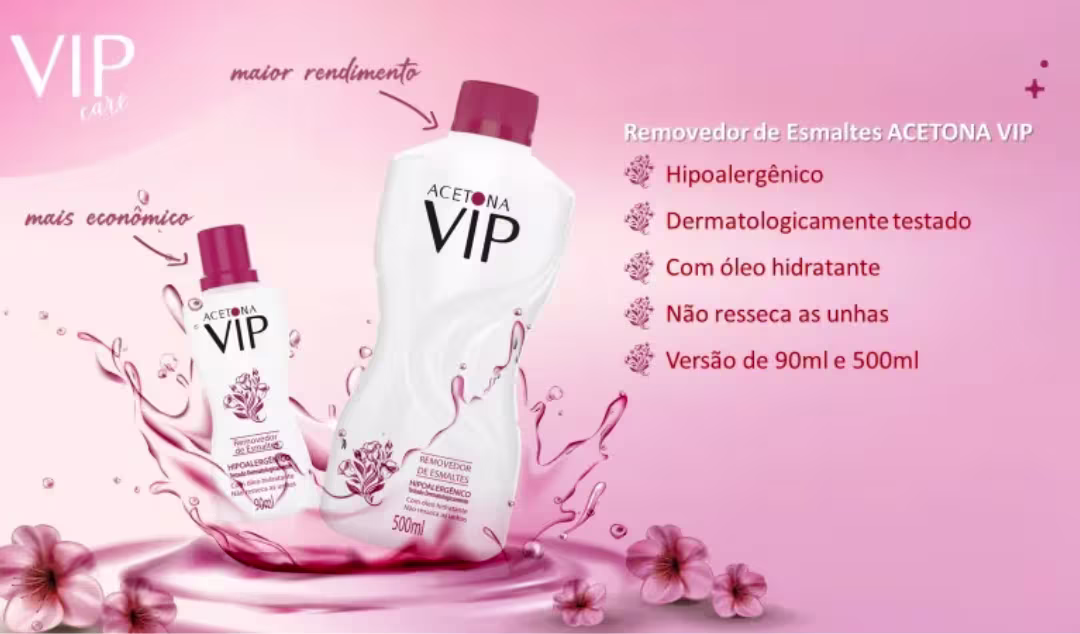 O Removedor de Esmaltes VIP 500ml foi desenvolvido para o uso contínuo, remove perfeitamente bases e esmaltes sem ressecar suas unhas e cutículas, possui uma fórmula especial elaborada à base de óleo de semente de uva e vitamina E, que juntos, evitam unhas enfraquecidas e ressecadas. A solução não resseca unhas, cutículas e as mantém profundamente hidratadas e resistentes. - O Removedor de Esmaltes possui uma agradável fragrância e proporciona muito mais saúde e beleza para as mãos. - E em sua formulação, evita que as unhas e cutículas se tornem fracas e quebradiças. Modo de usar: Aplicar no local desejado com auxílio de algodão até a completa remoção. Atenção: Manter longe do calor e do fogo, ao abrigo de luz e fora do alcance de crianças.