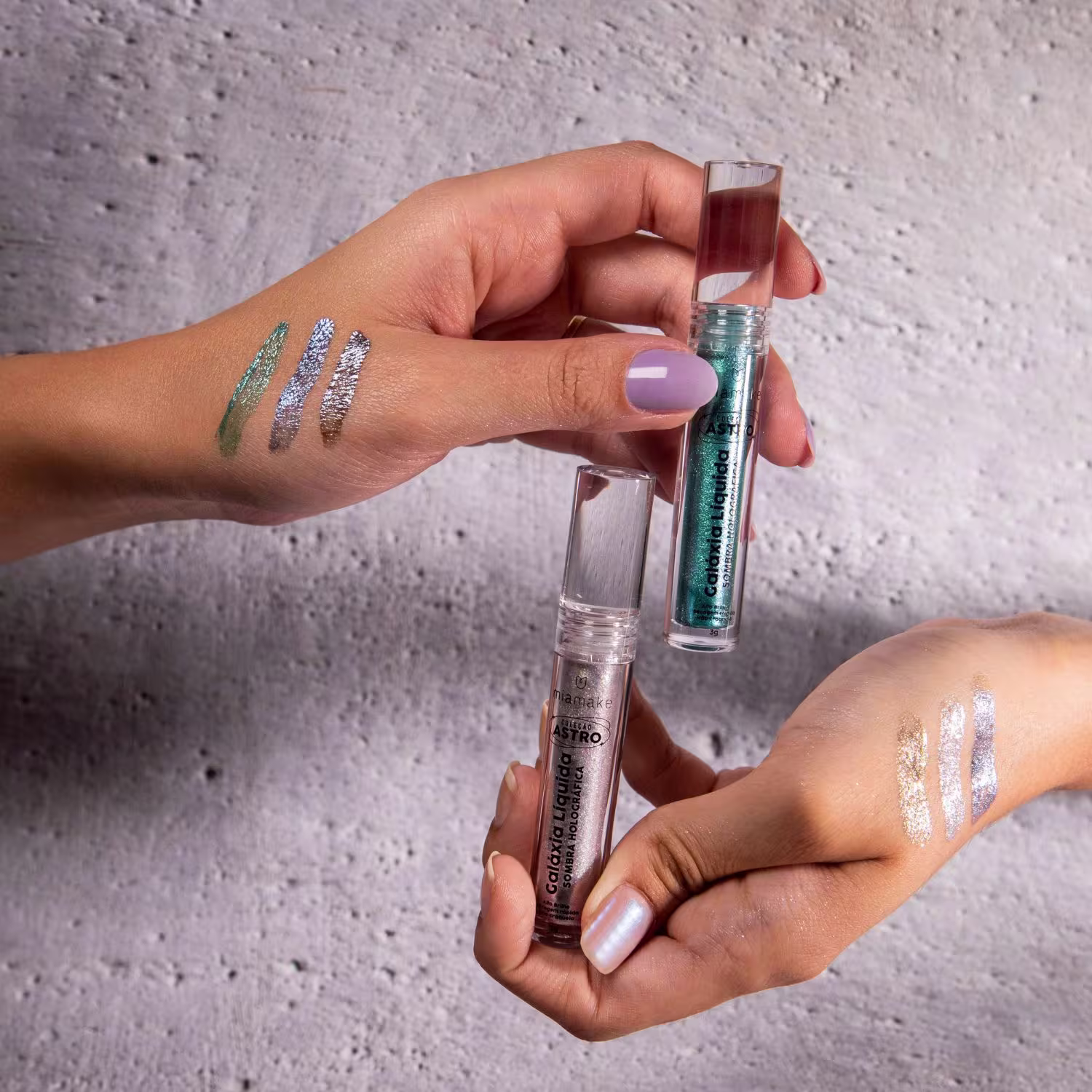 Prepare-se para uma maquiagem estelar! A Sombra Holográfica Galáxia Líquida da Mia Make na Kalola Cosmetics é o seu bilhete para um mergulho no cosmos.