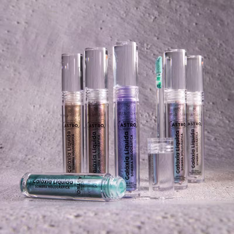 Prepare-se para uma maquiagem estelar! A Sombra Holográfica Galáxia Líquida da Mia Make na Kalola Cosmetics é o seu bilhete para um mergulho no cosmos.