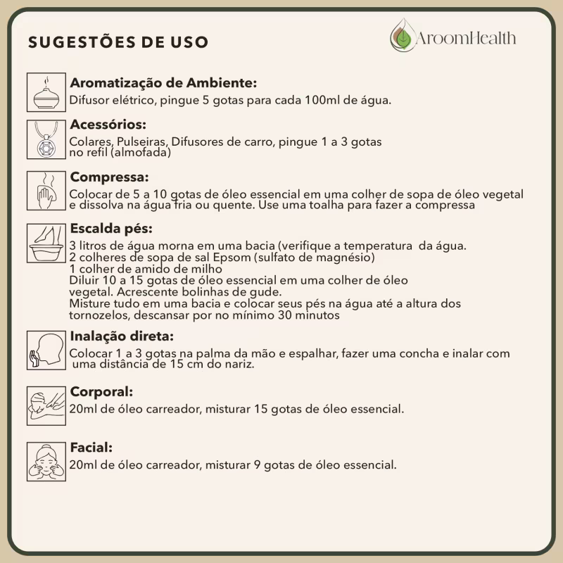 • Não utilize puro sobre o cabelo e pele — este óleo é dermoagressivo e deve ser bem diluído.
