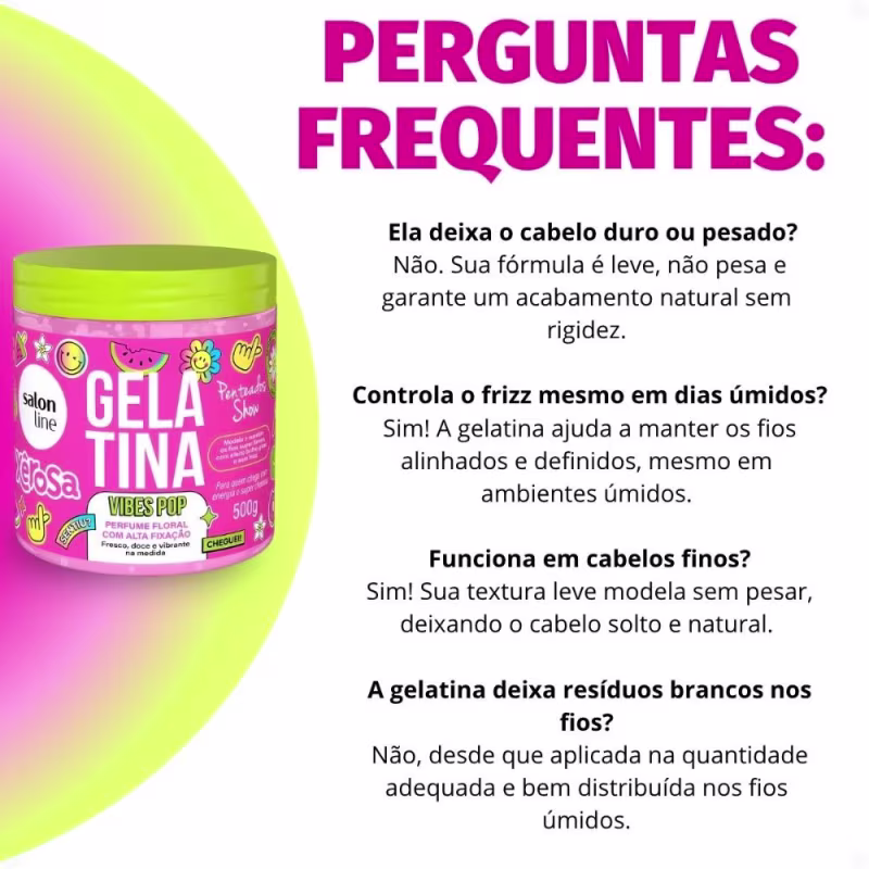 A Gelatina Capilar Salon Line Xêrosa Vibes Pop 500g é a solução ideal para quem busca cabelos com definição, fixação e brilho duradouros. Desenvolvida pela SALON LINE, esta gelatina leve não só modela os fios, mas também os mantém profundamente hidratados e completamente livres do frizz. Perfeita para todos os tipos de cabelo que desejam um visual impecável e saudável.