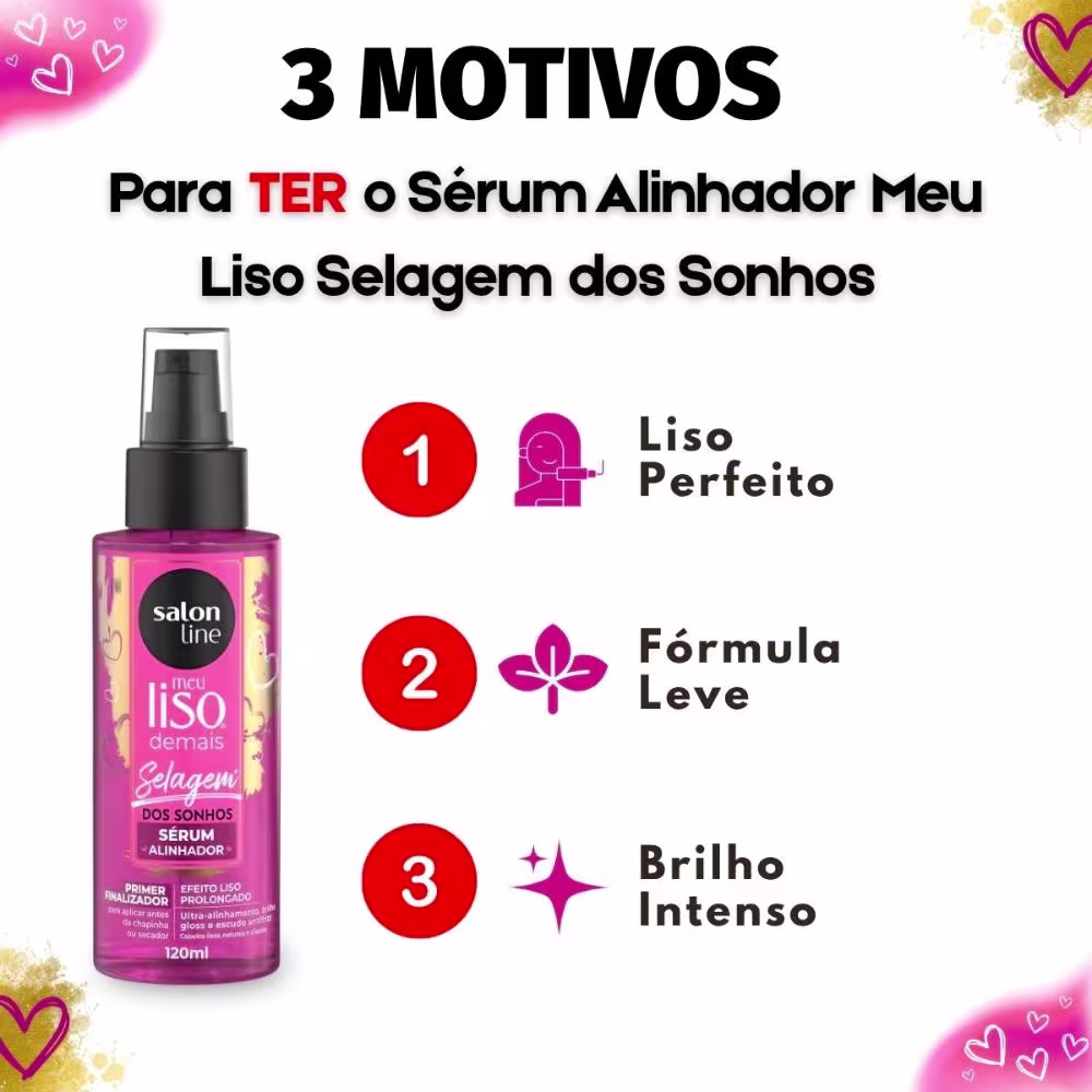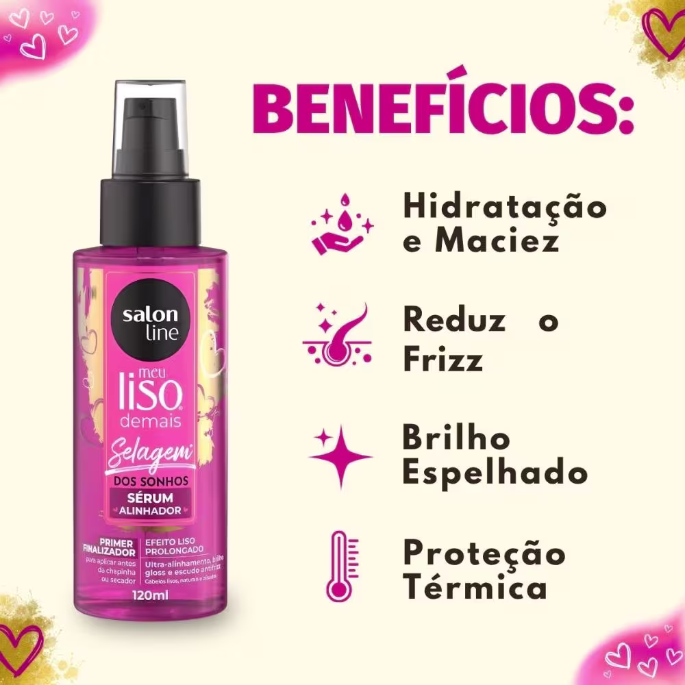 Não sei o CEPO Sérum Alinhador Salon Line Meu Liso Selagem Dos Sonhos 120ml é o tratamento definitivo para quem busca cabelos lisos, naturais e perfeitamente alinhados. Desenvolvido com uma fórmula exclusiva, este sérum atua como um primer finalizador essencial, ideal para ser aplicado antes do uso de chapinha ou secador. Ele proporciona um efeito liso prolongado e um brilho gloss incomparável, transformando a rotina de cuidados capilares em uma experiência de salão. Além de promover o ultra-alinhamento dos fios, este sérum inovador reduz significativamente o frizz e o volume excessivo, ao mesmo tempo em que oferece proteção térmica contra os danos causados pelo calor de ferramentas como chapinhas e secadores. É a solução perfeita para manter seus cabelos lisos, saudáveis e deslumbrantes.