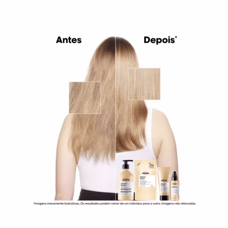 Não sei o CEPO Condicionador L'Oréal Professionnel Serie Expert Absolut Repair sem Pump 750ml foi desenvolvido para restaurar intensamente cabelos danificados, proporcionando maciez, força e brilho desde a primeira aplicação. Sua fórmula com Quinoa Dourada e Proteína Hidrolisada de Trigo atua na reparação da fibra capilar, reestruturando a superfície dos fios e formando um filme protetor que mantém as cutículas seladas e os nutrientes retidos por mais tempo. Com a exclusiva tecnologia de co-emulsão, que possui moléculas 50% menores, o tratamento penetra profundamente na fibra, oferecendo reparação sob medida sem pesar os fios. O resultado é um cabelo 77% menos danificado, com 7x mais brilho, toque suave e aparência saudável — perfeito para quem busca reconstrução e leveza em um só cuidado profissional.