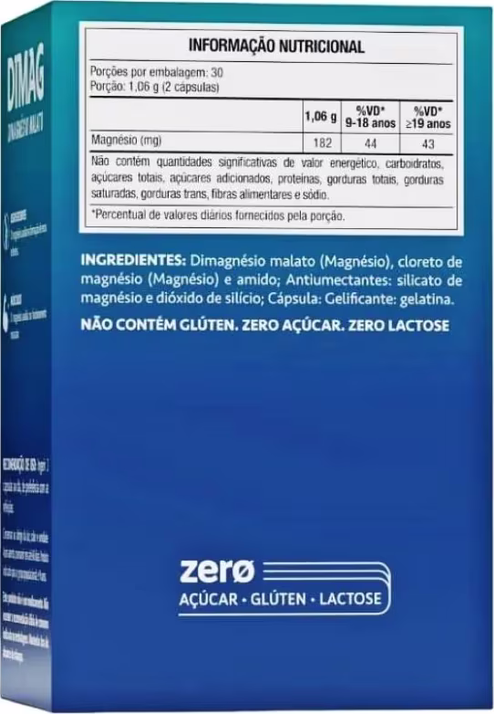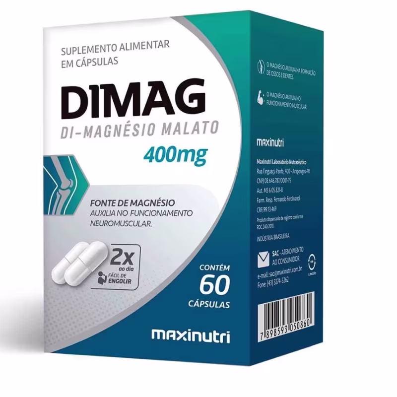 O Dimag 400mg é um suplemento alimentar em cápsulas, desenvolvido pela Maxinutri, formulado com Magnésio e Ácido Málico.