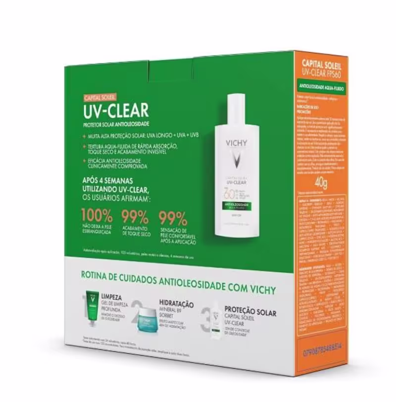 O Kit Vichy combina dois cuidados essenciais para peles oleosas e acneicas: 1 Protetor Solar Facial Capital Soleil UV-Clear Antioleosidade FPS 60 Sem Cor – 40g 1 Gel de Limpeza Facial Vichy Normaderm pele oleosa – 50g Juntos, oferecem limpeza profunda, controle da oleosidade e proteção solar avançada com tratamento antimarcas.