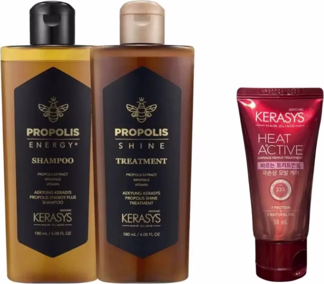 Kerasys Kit Propolis Shine (Sh180ml + Cd180ml) + Heat Active 50mlO trio que limpa, trata e protege com calor. Shampoo Propolis Energy+ 180 ml para uma limpeza equilibrada (pH 4–5), Tratamento Propolis Shine 180 ml para hidratação e selagem de cutículas, e Heat Active™ Damage Repair 50 ml para proteção térmica até 230 °C e acabamento de salão.