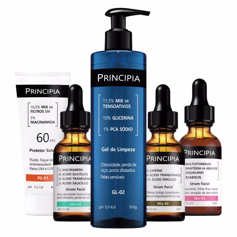 Não sei o CEPKit com cinco produtos com alta eficácia para rotina diária de cuidados com a pele: um gel de limpeza facial GL-02 com mix de tensoativos + glicerina + PCA sódio, um sérum com multivitaminas + manteiga de abacate + bisabolol + esqualano, um sérum Mix-01 com associação de quatro ativos um Mix-02 com 5% de Cafeína, 3% de Ácido Tranexâmico e 0,5% de Ácido Ferúlico, e um protetor solar Facial fluido antioleosidade FPS 60 + niacinamida com toque seco e eficácia contra raios UVA e UVB.