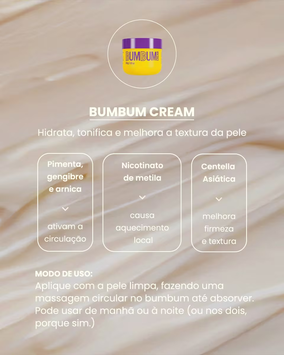 O Bumbum Cream é um creme corporal multifuncional que auxilia na suavização da aparência de celulite, estrias e flacidez, além de ajudar a prevenir foliculite e pelos encravados.