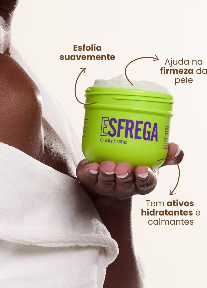 Esfolie com o Esfrega: aplique sobre a pele úmida, massageando em movimentos circulares por alguns minutos. Enxágue bem.
