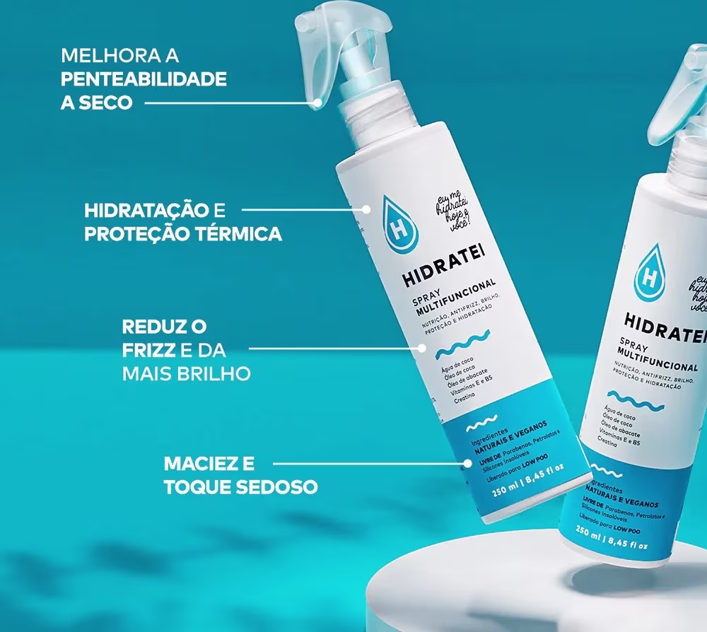 Dica: o Hidratei Spray Multifuncional pode ser usado como condicionador durante o banho ou como leave-in sem enxágue após a lavagem.