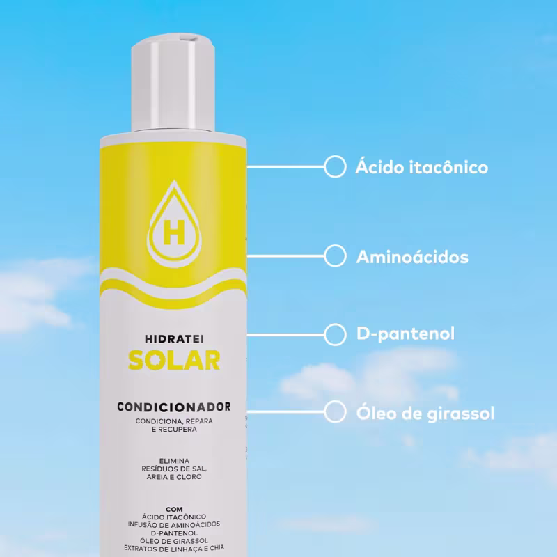 O Condicionador Solar Hidratei complementa o tratamento, proporcionando nutrição profunda e selagem instantânea da cutícula capilar.