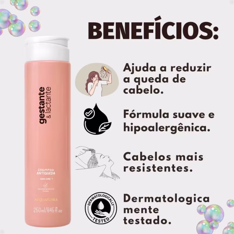 Este shampoo é perfeito para mulheres que estão grávidas ou amamentando e buscam uma solução segura e eficaz para a queda de cabelo. Ideal para uso diário ou conforme a necessidade, proporcionando um cuidado contínuo e preventivo durante essa fase tão especial da vida. Use-o em sua rotina de banho para manter seus cabelos fortes e saudáveis, sem comprometer a saúde do seu bebê.