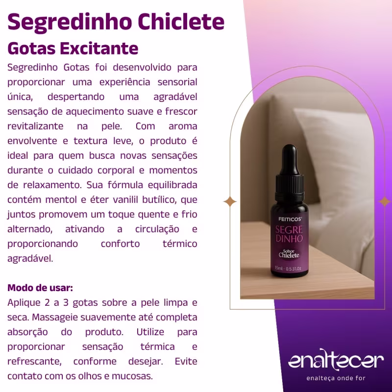 Segredinho Gotas Chiclete foi desenvolvido para proporcionar uma experiência sensorial única, despertando uma agradável sensação de aquecimento suave e frescor revitalizante na pele. Com aroma envolvente e textura leve, o produto é ideal para quem busca novas sensações durante o cuidado corporal e momentos de relaxamento. Sua fórmula equilibrada contém mentol e éter vanilil butílico, que juntos promovem um toque quente e frio alternado, ativando a circulação e proporcionando conforto térmico agradável. Dermatologicamente testado e com formulação vegana, livre de parabenos e cruelty-free, o produto garante segurança e cuidado para todos os tipos de pele. Benefícios: Proporciona sensação de aquecimento suave Promove efeito térmico alternado e relaxante Fórmula leve e de rápida absorção Textura fluida, fácil de aplicar Aroma agradável em diversas opções. Produto vegano, sem parabenos e cruelty-free Informações