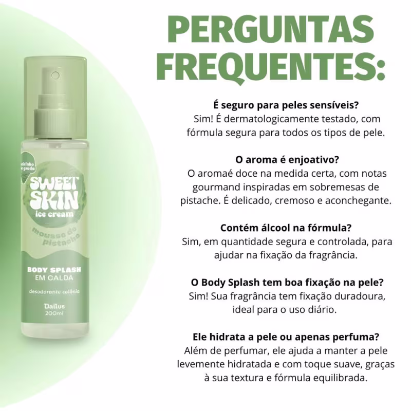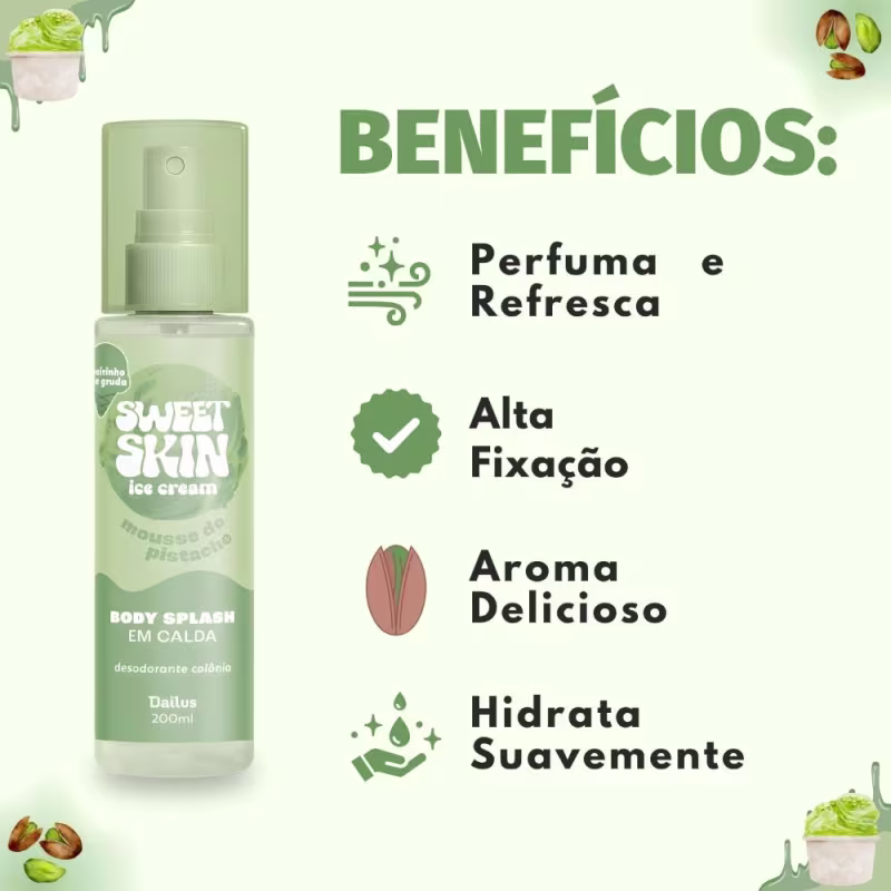 O Body Splash Em Calda Dailus Sweet Skin Ice Cream Mousse De Pistache 200ml é a escolha perfeita para quem busca uma experiência olfativa deliciosa e refrescante, ideal para combater o calor e trazer uma sensação de bem-estar imediata. Inspirado na doçura e cremosidade do mousse de pistache, este body splash da DAILUS envolve a sua pele em uma fragrância gourmand irresistível, perfeita para o dia a dia. Proporcione à sua pele um toque de frescor e um aroma que remete a momentos de pura indulgência, deixando um rastro suave e marcante por onde você passar. Ideal para quem busca um toque de alegria e leveza na rotina.