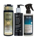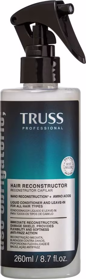 Tratamento líquido para cabelos quebradiços, desidratados e com química. TRUSS Uso Obrigatório um tratamento de reconstrução com e sem enxágue, que pode ser usado como máscara ou finalizador, para blindagem contra danos e ação condicionante.