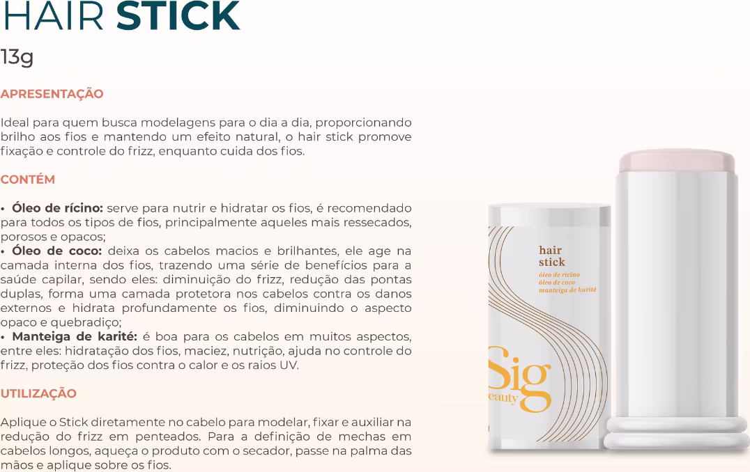 Não sei o CEPIdeal para quem busca modelagens para o dia a dia, proporcionando brilho aos fios e mantendo um efeito natural, o Hair Stick promove fixação e controle do frizz, enquanto cuida dos fios. Modo de usar: Aplique o Stick diretamente no cabelo para modelar, fixar e auxiliar na redução do frizz em penteados. Para a definição de mechas em cabelos longos, aqueça o produto com o secador, passe na palma das mãos e aplique sobre os fios.Composição em português: óleo da semente de mamona, cera branca de abelha, manteiga de karité, álcool cetearílico, cera de candelilla, fenil trimeticona, óleo de coco, perfume, fenoxietanol, pentaeritritil tetra-di-t-butil hidroxihidrocinamato, salicilato de benzila, cumarina, hexil cinamal, hidroxicitronelal, hidroxiisoexil 3-cicloexeno carboxaldeído, isoeugenol, linalol.