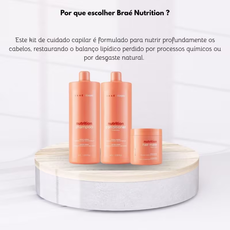 O kit Bráe Stages Nutrition Shampoo, Máscara e Condicionador foi desenvolvido para devolver a nutrição essencial aos cabelos, equilibrando hidratação e reposição lipídica. Sua fórmula age de forma completa: o shampoo limpa delicadamente sem ressecar, o condicionador desembaraça e sela as cutículas, enquanto a máscara penetra profundamente para restaurar maciez, resistência e vitalidade. É um tratamento completo para recuperar fios frágeis, devolvendo movimento e brilho saudável desde o primeiro uso.