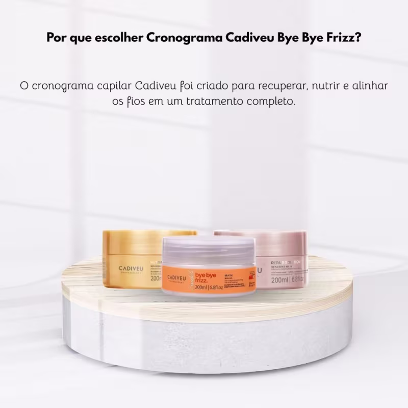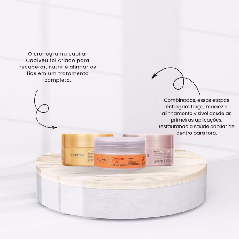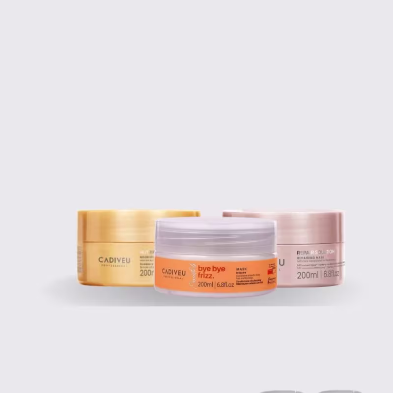 O cronograma capilar Cadiveu foi criado para recuperar, nutrir e alinhar os fios em um tratamento completo. A máscara Nutro Glow devolve a nutrição e o brilho, Repair Solution atua na reconstrução da fibra capilar fragilizada, e Bye Bye Frizz controla o volume e suaviza os fios rebeldes. Combinadas, essas etapas entregam força, maciez e alinhamento visível desde as primeiras aplicações, restaurando a saúde capilar de dentro para fora.