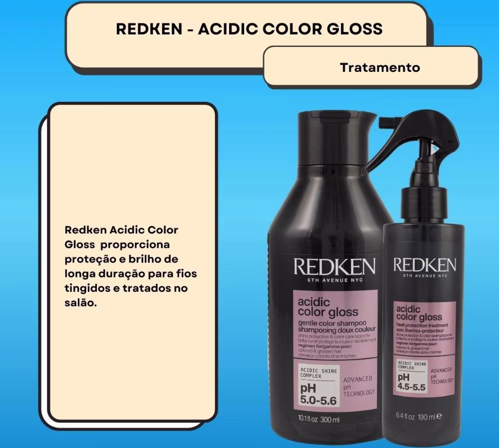 Não sei o CEPShampoo para cabelos tratados com coloração semi ou permanente. Redken Acidic Color Gloss proporciona proteção e brilho de longa duração para fios tingidos e tratados no salão.