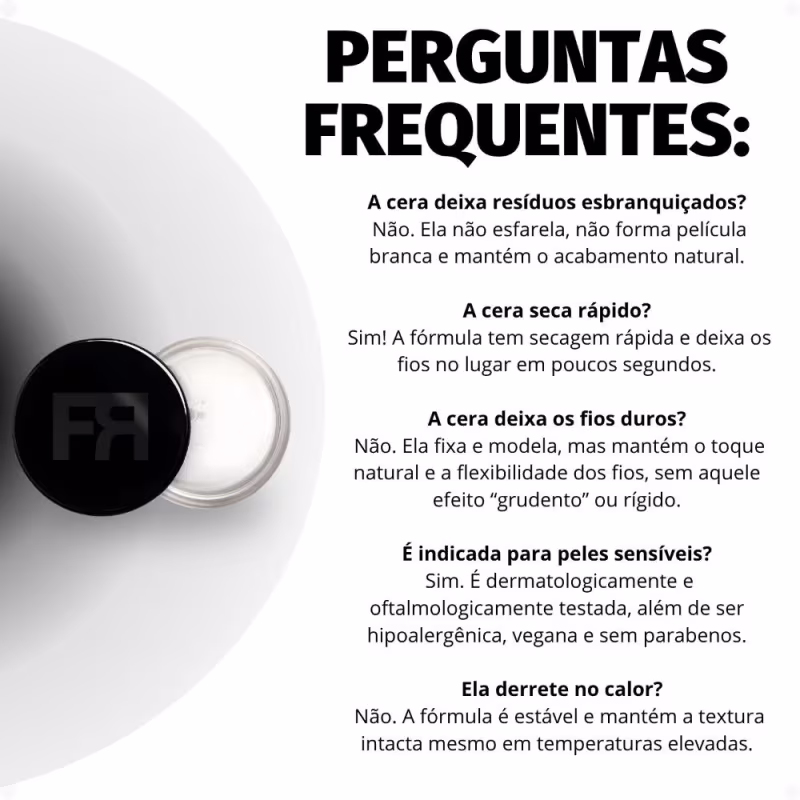 Use a escovinha para aplicar o produto e escove as sobrancelhas no formato desejado. Comece aplicando uma pequena quantidade de cera e adicione mais conforme necessário para obter a fixação desejada. Mantenha a tampa sempre bem fechada quando o produto não estiver em uso.