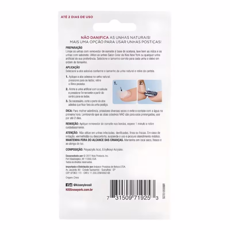 Desenvolvido com acrílico de alta resistência e um adesivo hipoalergênico, este kit proporciona não apenas beleza, mas também conforto e segurança para suas unhas. Obtenha um visual deslumbrante e duradouro, destacando-se com unhas stiletto de comprimento médio que complementam perfeitamente seu estilo. Experimente a praticidade e a elegância que só a KISS NEW YORK pode oferecer.
