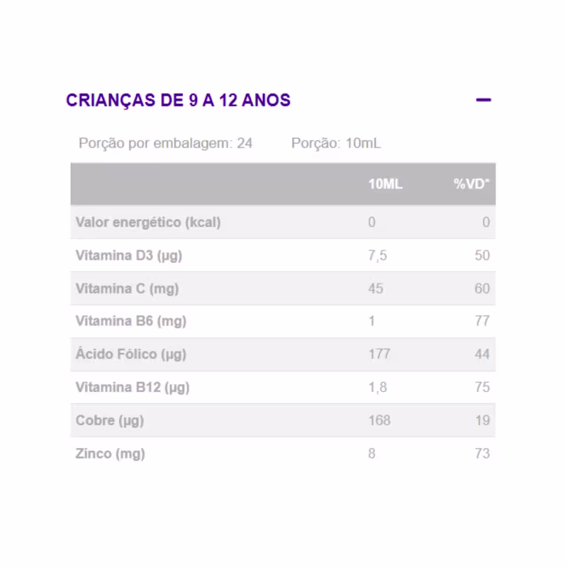 Crianças de 9 a 12 anos ingerir 10ml ao dia.