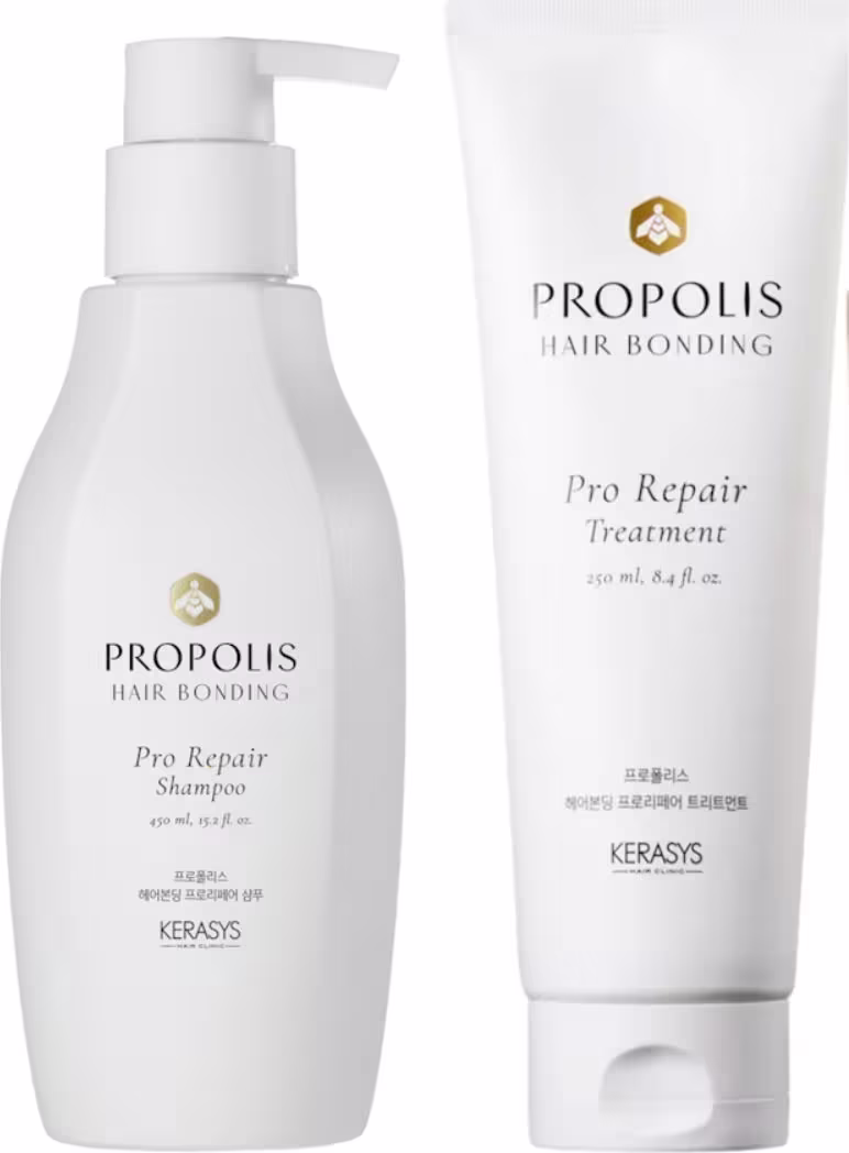 Kerasys Trio Própolis (Sh e Máscara Pro Repair + Leave in No Wash 200ml)Ideal para cabelos danificados por química, calor ou exposição ambiental, fios porosos, frágeis, com pontas duplas e aspereza ao toque.