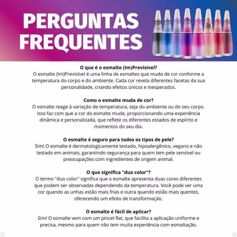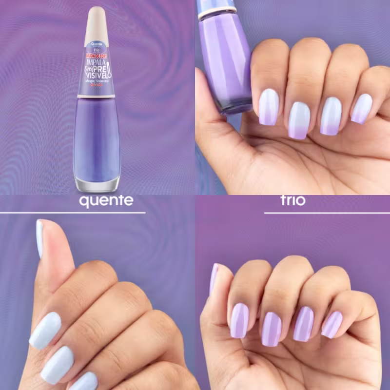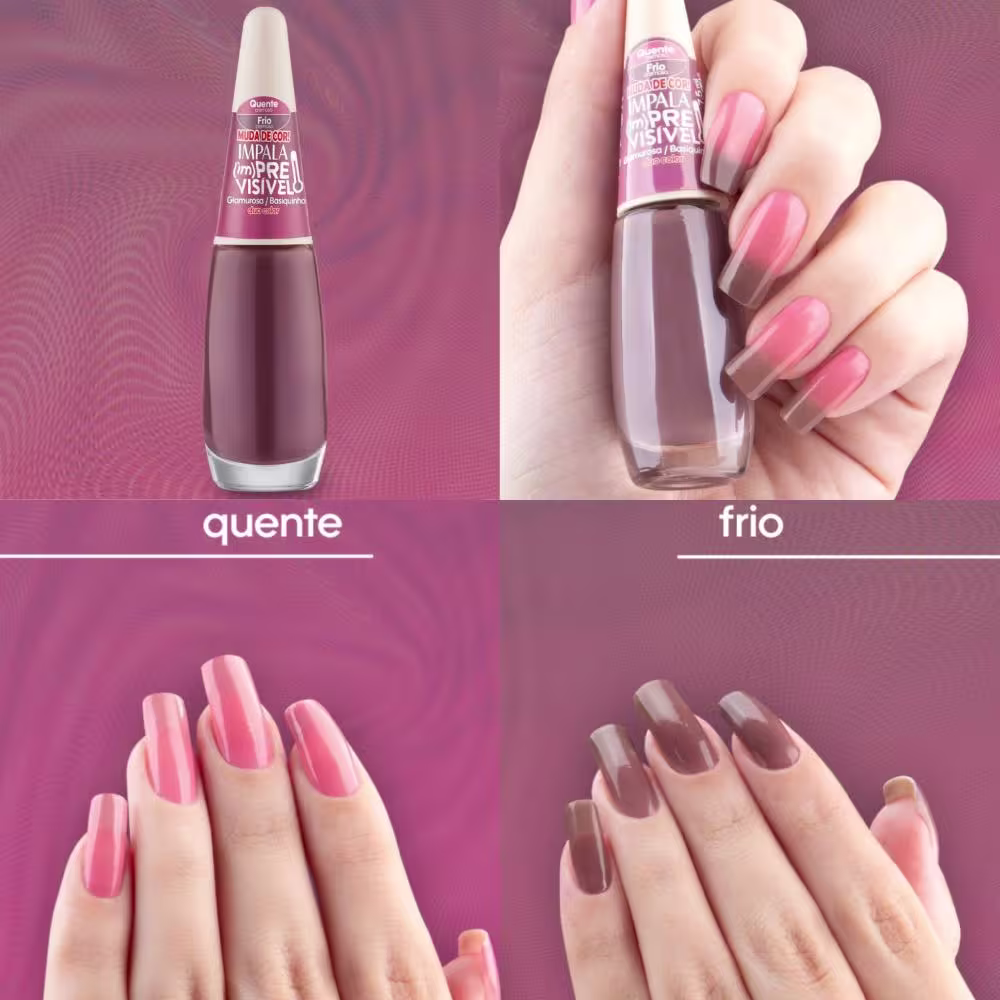 A coleção (im)Previsível – uma linha de esmaltes que mudam de cor conforme a temperatura do corpo e do ambiente, refletindo as muitas camadas da sua personalidade em contrastes inesperados. Cada esmalte traduz suas diferentes faces, adaptando-se ao que o momento exige. Todas as cores são hipoalergênicas, veganas e não testadas em animais.