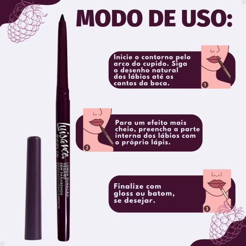 Com os lábios limpos e hidratados, contorne cuidadosamente os lábios, iniciando pelo arco do cupido e seguindo até os cantos da boca, para garantir definição e evitar que o batom escorra.