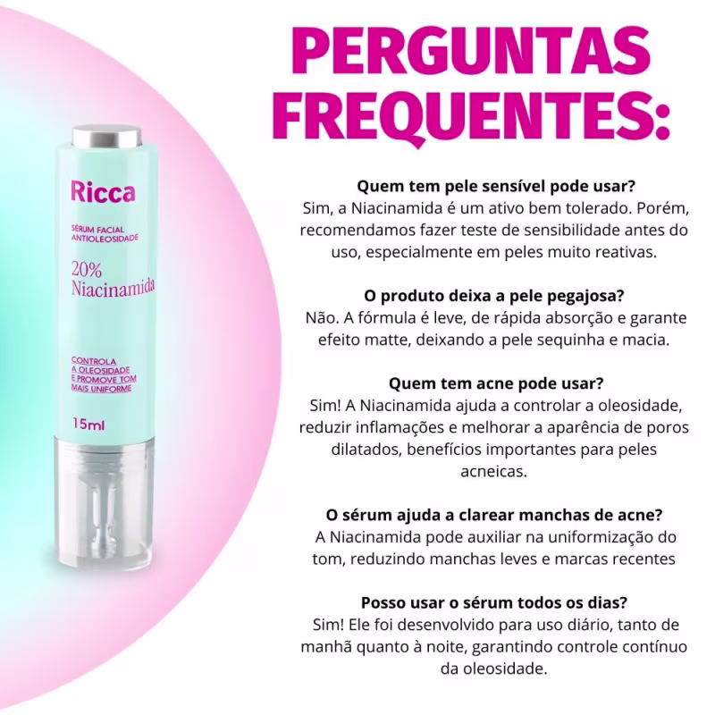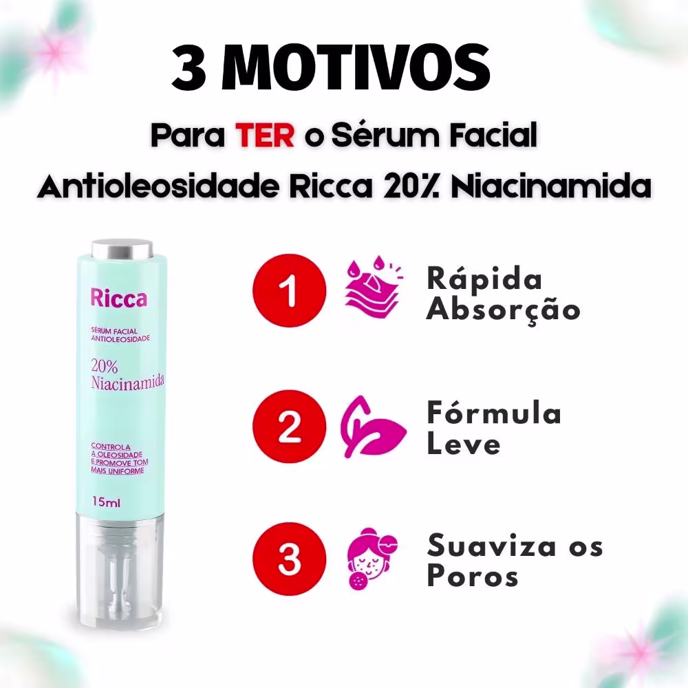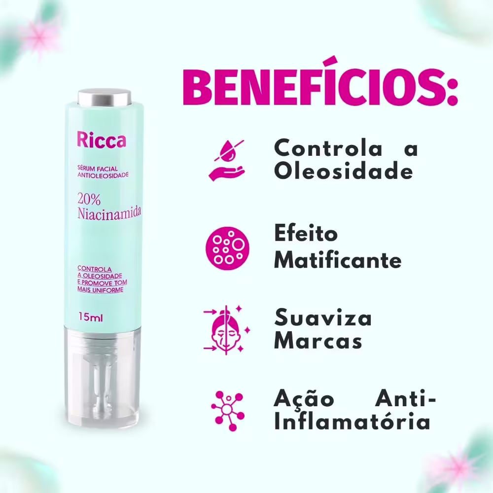 O Sérum Facial Antioleosidade Ricca 20% Niacinamida 15ml é o aliado perfeito para todas as ocasiões, desde a rotina diária de cuidados com a pele até momentos especiais em que você deseja exibir uma aparência impecável. Ideal para ser incorporado tanto na sua rotina matinal, preparando a pele para receber a maquiagem, quanto na noturna, auxiliando na regeneração celular durante o sono. Use-o como um passo essencial do seu regime de beleza para manter a pele do rosto sob controle, com um aspecto saudável, radiante e livre de oleosidade excessiva.