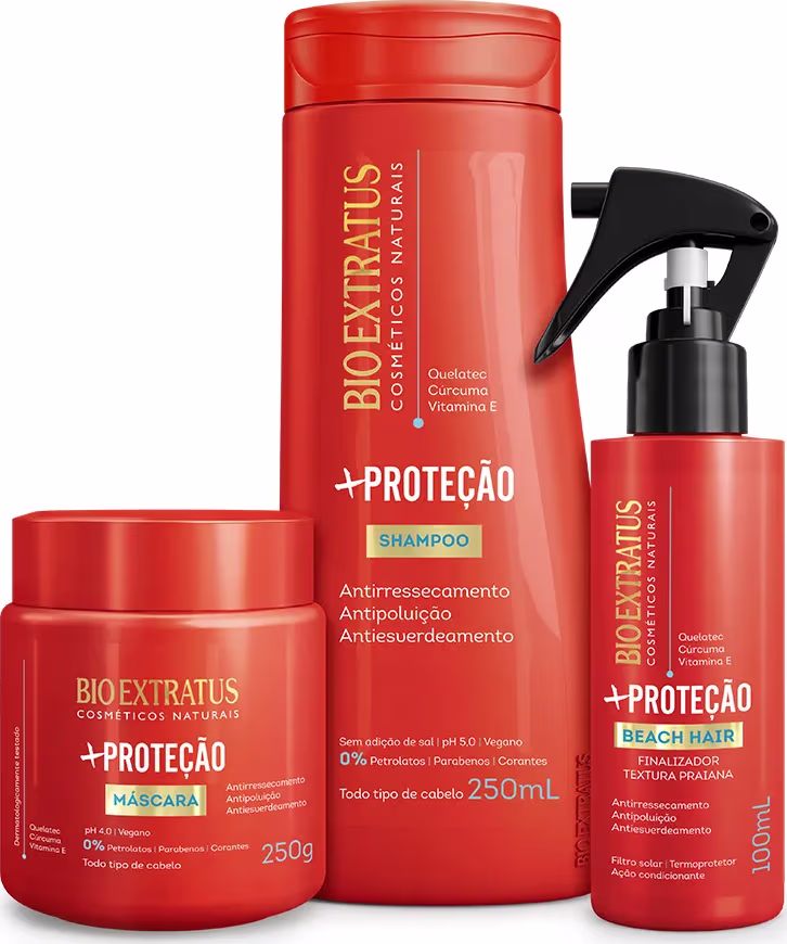 Praia, piscina, rua... os cabelos sempre encontram agentes agressores, em qualquer ambiente. Para evitar que os danos aconteçam, a linha +Proteção blinda os fios contra poluentes, tem ação quelante que desintoxica, eliminando metais pesados, ajuda a evitar e a retirar o esverdeado causado na piscina, protege do sol, do calor do secador, do desbotamento e do ressecamento. Um verdadeiro escudo protetor para os fios.