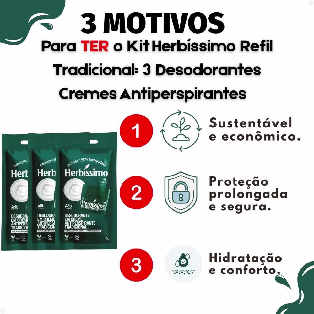 Garanta proteção eficaz e duradoura contra o suor e o mau odor com o Desodorante Em Creme Refil Herbíssimo Tradicional Antiperspirante 45g. Desenvolvido pela tradicional marca HERBISSIMO, este refil é a escolha inteligente para quem busca economia sem abrir mão da qualidade e do cuidado com o meio ambiente. Sinta a confiança de estar protegido o dia todo, com uma fórmula suave que hidrata a pele e evita irritações. Ideal para homens e mulheres que prezam por praticidade e bem-estar, este refil é perfeito para manter a sua rotina de higiene pessoal em dia, com a vantagem de um produto sustentável e econômico.