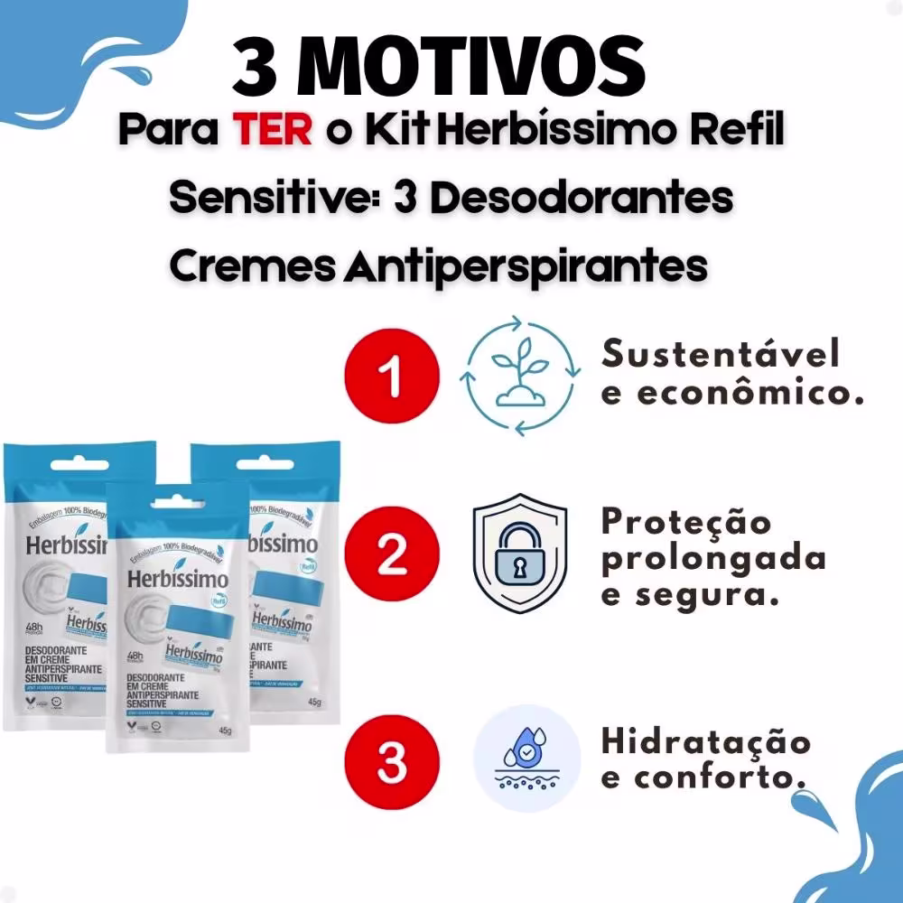 Perfeito para o uso diário, o Kit Herbíssimo Refil Sensitive é a escolha ideal para quem busca proteção duradoura e cuidado especial para as axilas, seja na rotina de trabalho, atividades físicas ou momentos de lazer. Sua fórmula suave é especialmente indicada para pessoas com peles sensíveis que necessitam de hidratação e proteção contínua. Ideal para usar após a depilação, em viagens ou em qualquer situação que exija proteção extra e conforto.