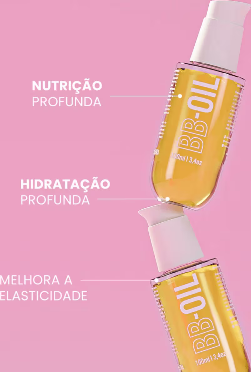 O BB-Oil é um óleo corporal vegano, sem fragrância, com textura leve e toque seco. Enriquecido com óleos vegetais como Rosa Mosqueta, Abacate, Amêndoas, Girassol e Vitamina E, ele nutre profundamente, melhora a elasticidade da pele e previne o aparecimento de estrias — sem deixar sensação pegajosa. Ideal para o uso diário nas regiões mais propensas ao ressecamento ou flacidez.